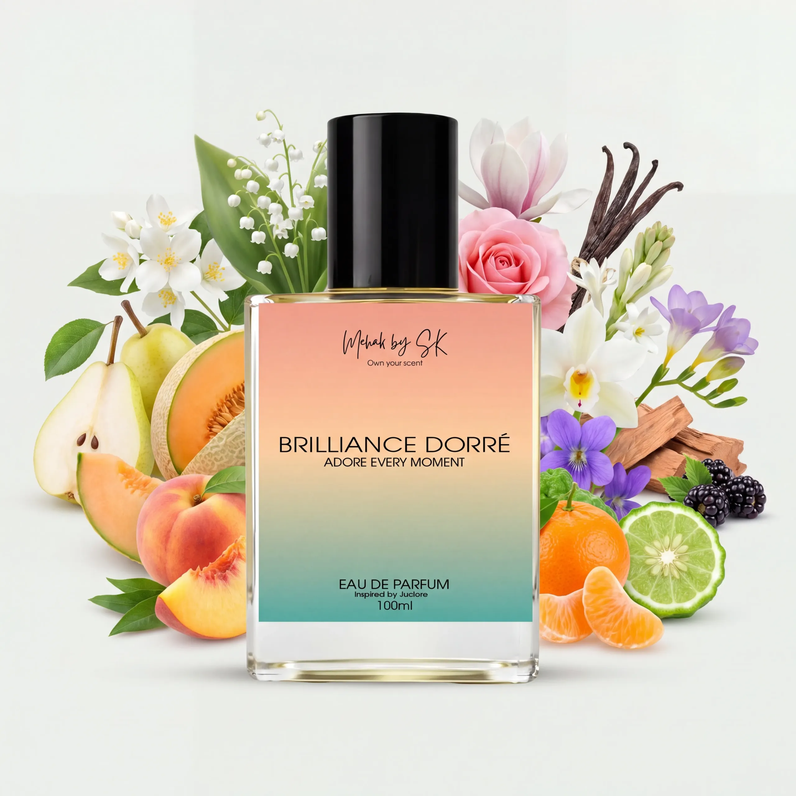 Brilliance Dorré is a radiant celebration of femininity — a fragrance that shines with sophistication, grace, and timeless charm. It opens with a luminous bouquet of fresh fruity notes, leading into a heart of opulent florals that bloom like golden light. The warm, sensual base wraps the skin in an elegant trail, leaving a lasting impression of pure luxury.