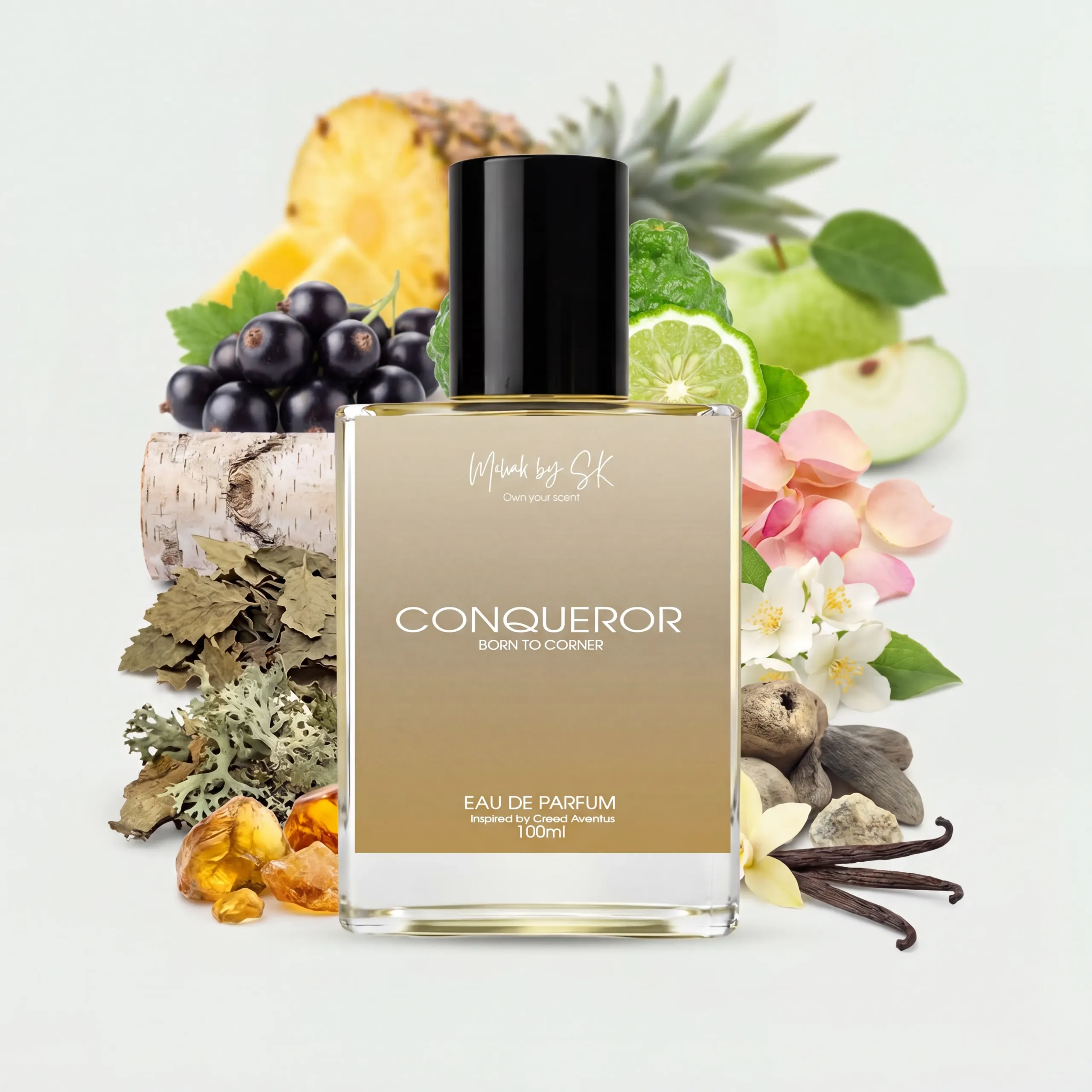 Conqueror embodies power, confidence, and timeless elegance. Crafted for the modern leader, this bold and refined fragrance opens with a burst of fruity freshness, evolves into a rich heart of florals and spices, and settles into a commanding woody base. A scent made to make a statement — strong, sophisticated, unforgettable.