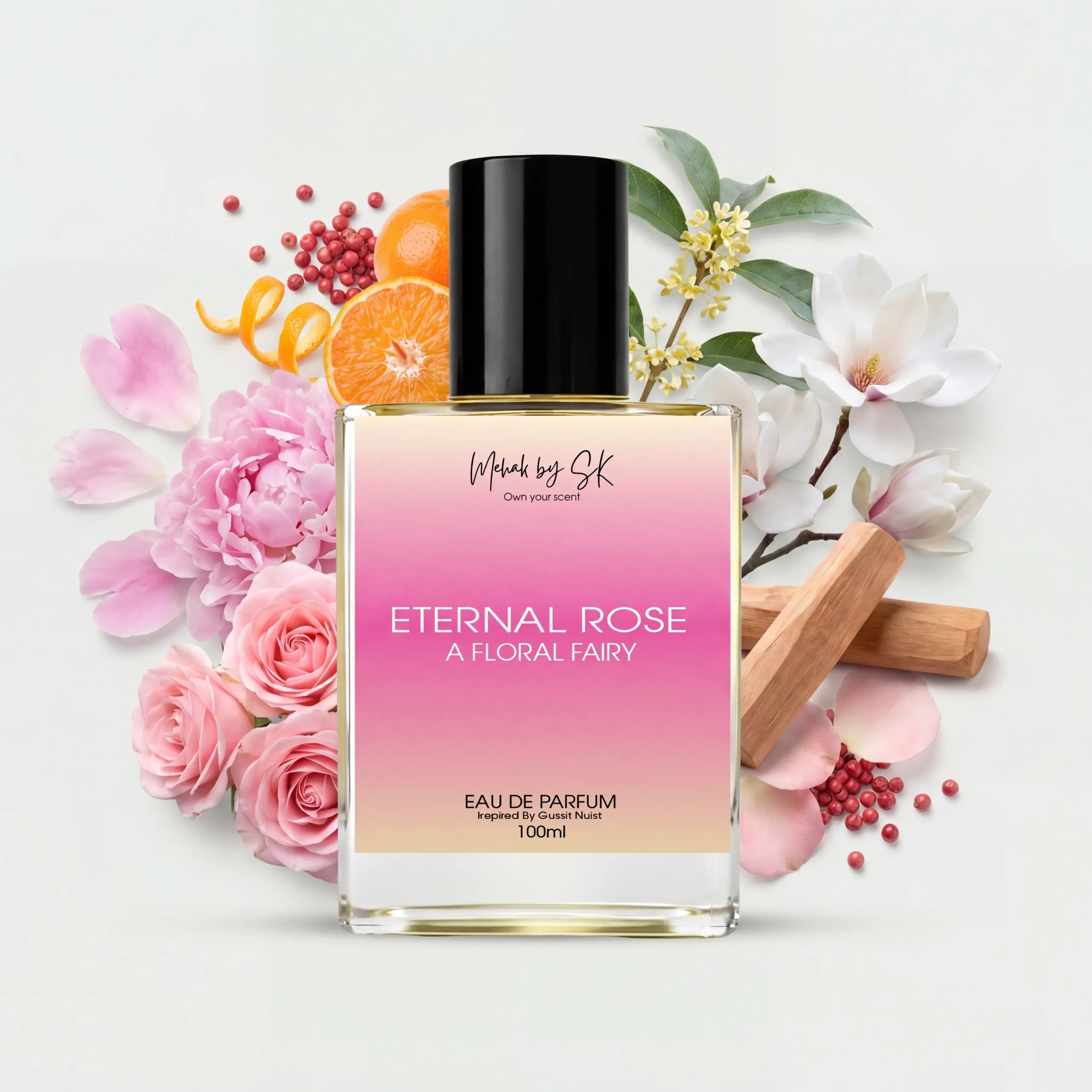 It opens with the sparkling freshness of citrus and radiant peony, uplifting the senses with pure joy. At its heart, a delicate bouquet of rose, osmanthus, and magnolia unfolds, weaving together romance, warmth, and timeless elegance. The fragrance lingers on a graceful base of sandalwood and pink pepper, leaving behind a trail that is both sophisticated and unforgettable.